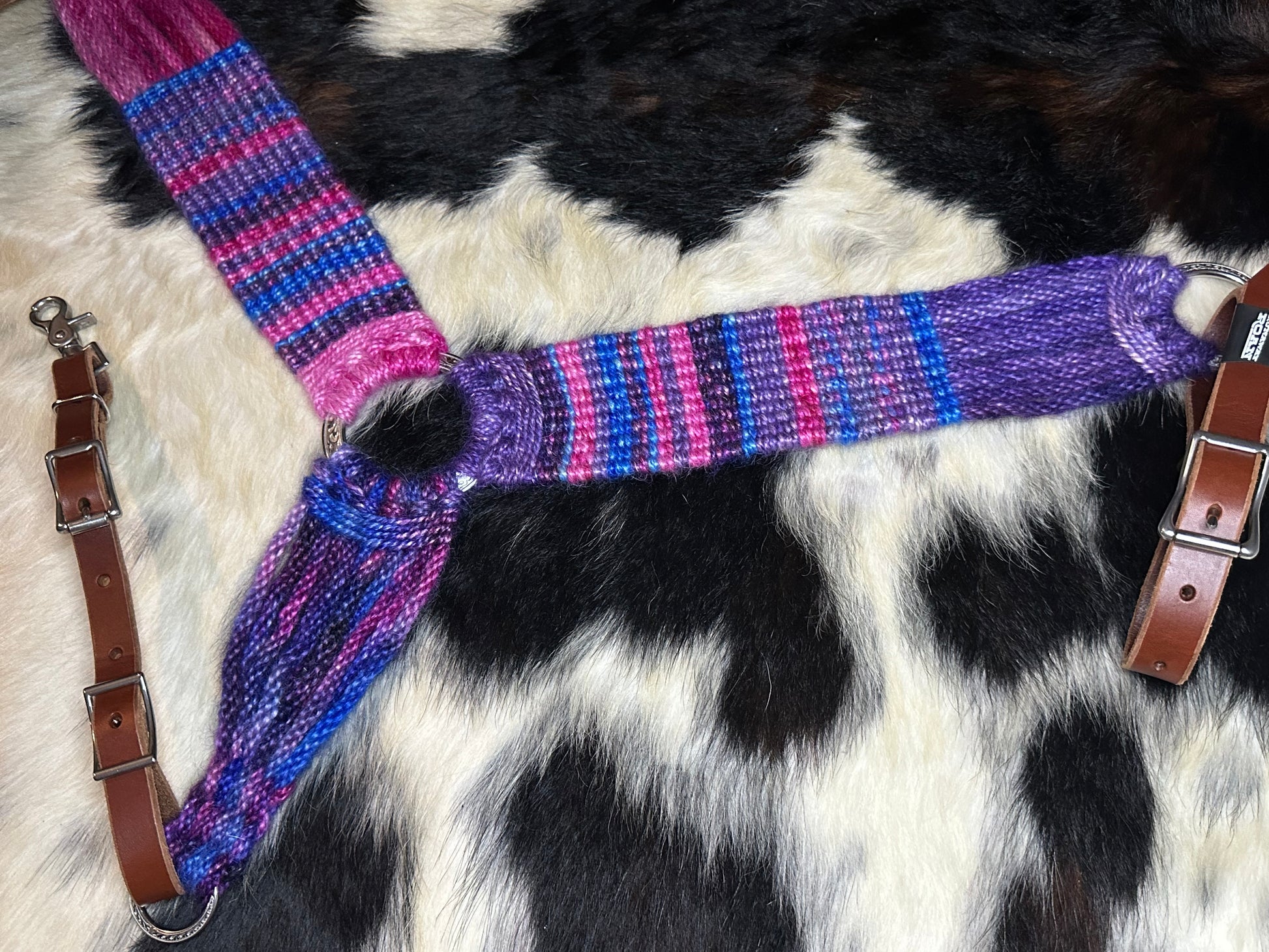 Slightly larger then average (average is 36”) this breast collar measures 37.5” from end to end and paired with medium tugs and custom dyed mohair